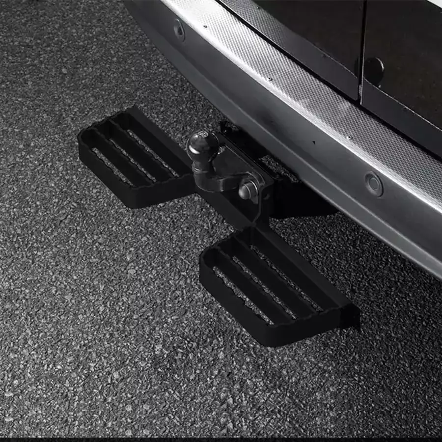 Bakre fotsteg med en bredd på 600 mm till dragkroken. Fästnings bultarnas avstånd 90mm. Tillverkat av svart lackerat rostfritt stål, kvalitetsprodukt från Metec.